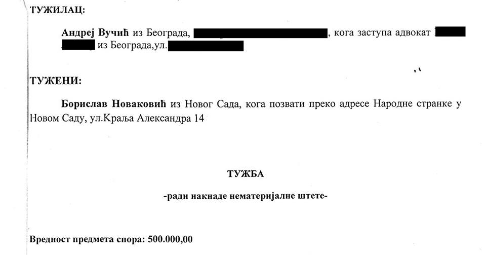 Prenosimo vam objavu Borislava Novakovića i fotografije tužbe: