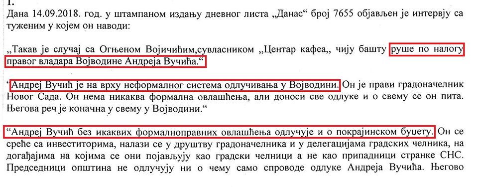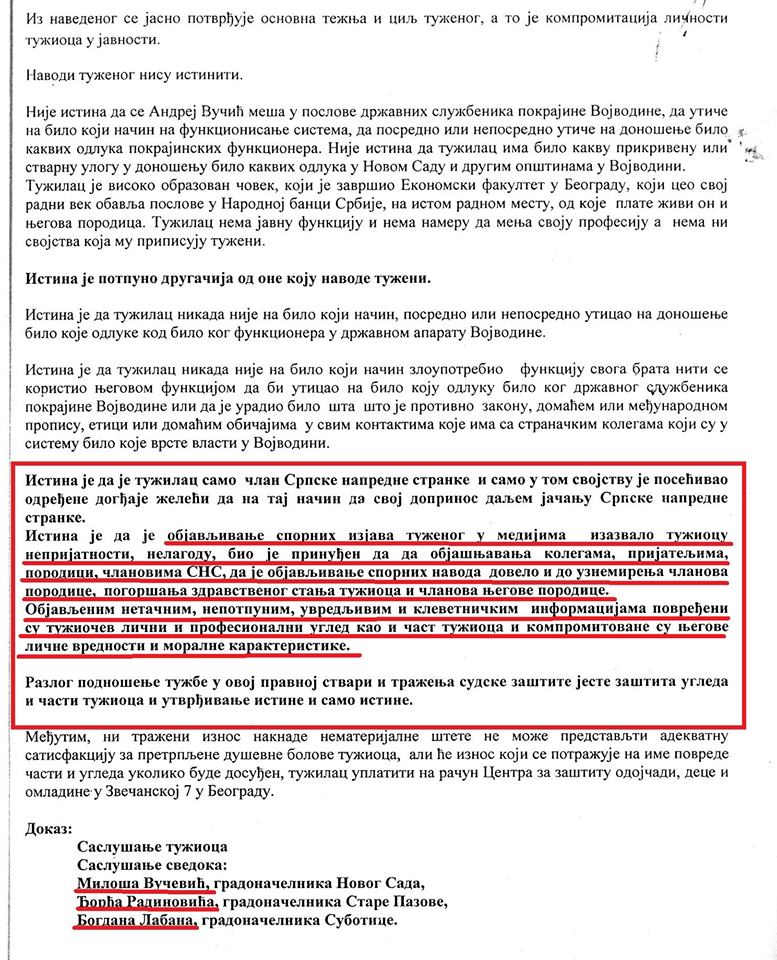 U tužbi Andreja Vučića između ostalog je navedeno i da je Borislav Novaković povredio Andrejev ugled i čast, kao i da je zbog toga došlo do uznemirenja članova poredice i pogoršanje zdravstvenog stanja i njega i članova porodice.