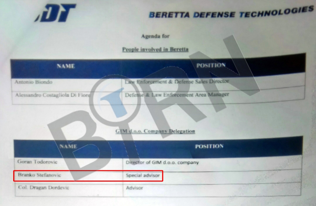 Branko Stefanović je u maju 2019. godine kao član delegacije firme GIM posetio italijansku fabriku oružja “Bereta” zajedno sa delegacijom Ministarstva unutrašnjih poslova Srbije, saznaje BIRN.