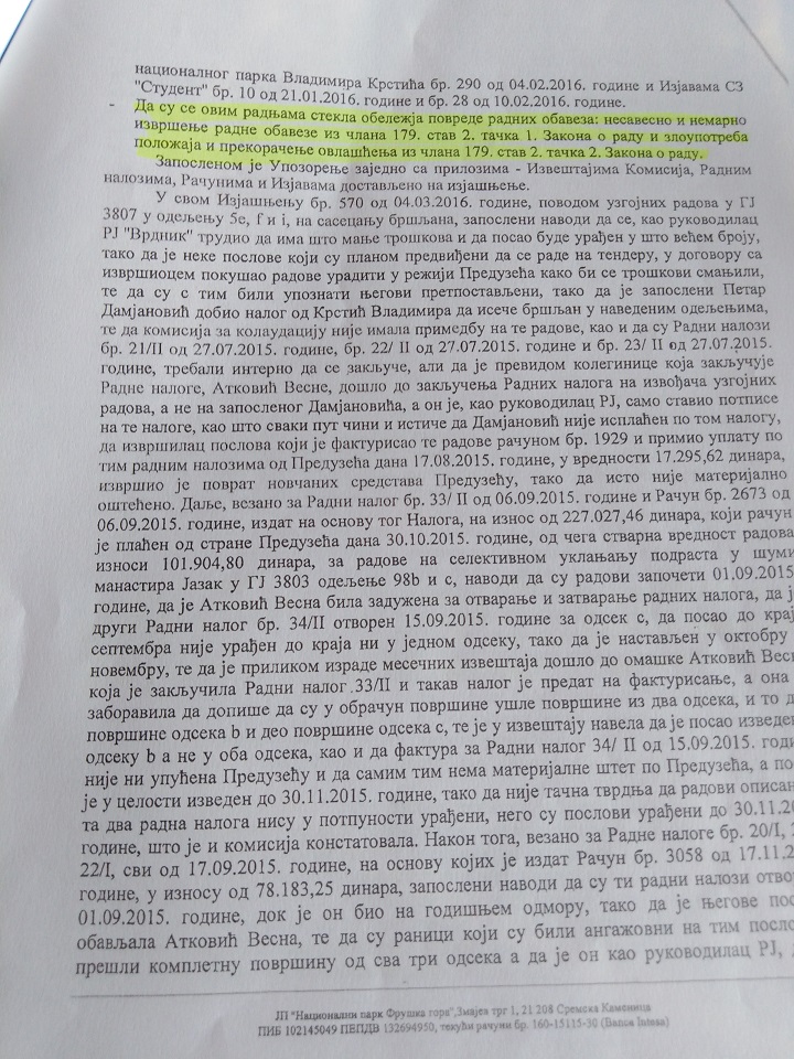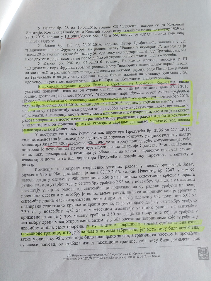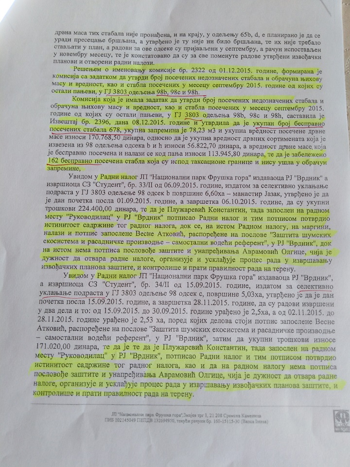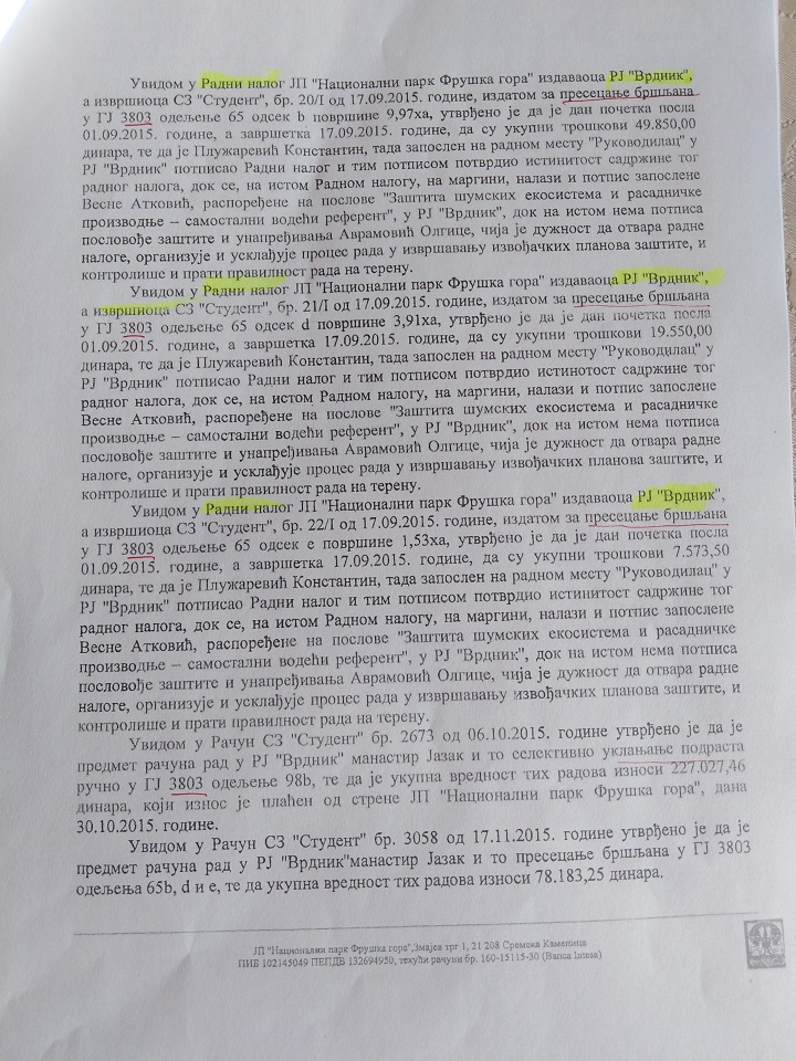U istom izvestaju takođe je utvrđeno da je rukovodilac RJ Vrdnik Konstantin Plužarević potpisao radne naloge za neizvršene poslove nege šume (selektivno uklanjanje podrasta i uklanjanje bršljena) koji su bili povereni SZ „Student“ is Novog Sada.