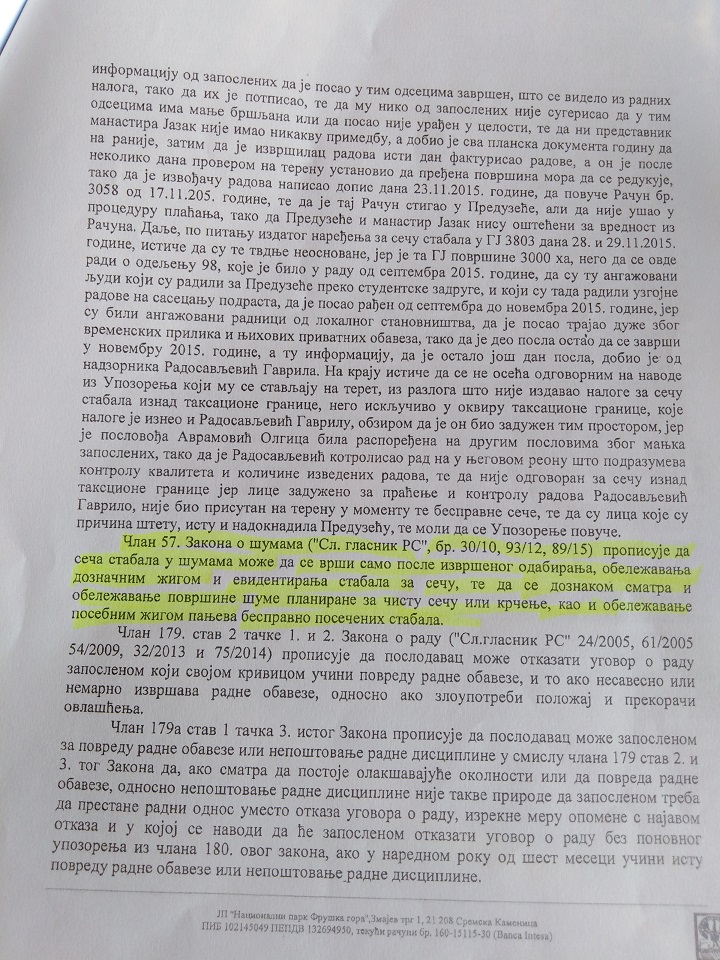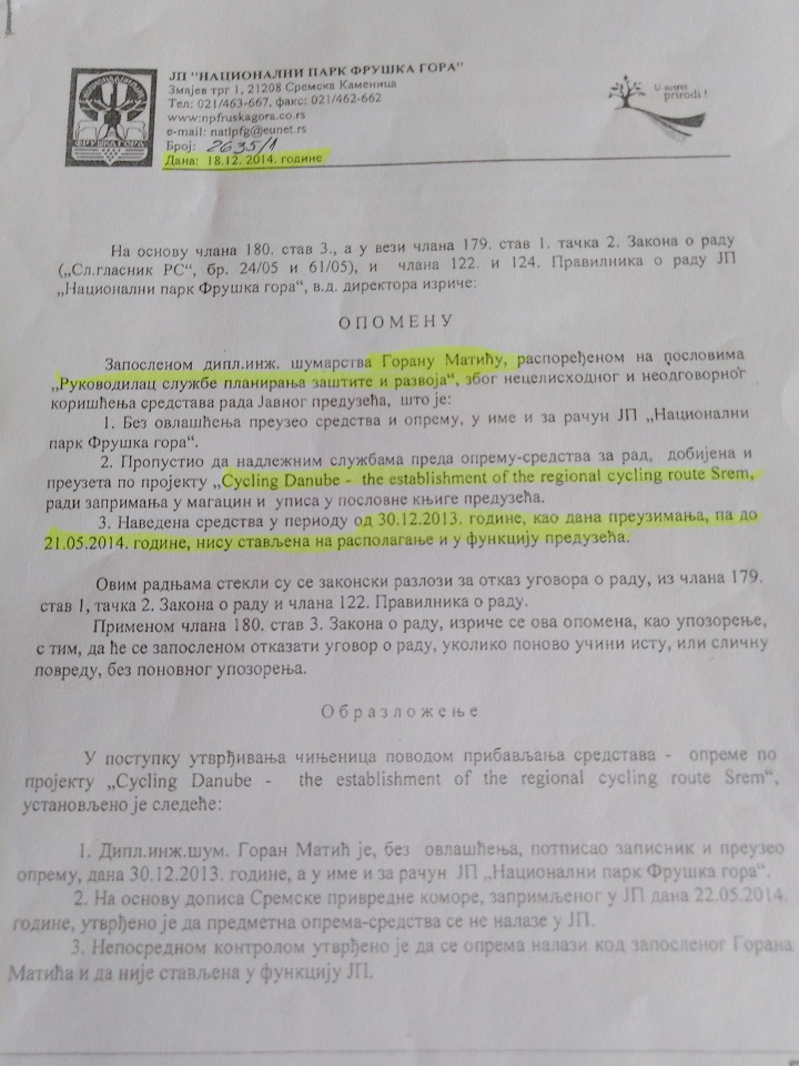 Naime, izvesnom Konstantinu Plužareviću dipl.inžinjeru šumarstva, izrečena je 21.03.2016. mera opomene sa najavom otkaza zbog povrede radnih obaveza – nesavesnog i nemarnog izvršavanja radne obaveze iz čl.179 stav2. tačka1. Zakona o radu. Ova mera se sastoji u tome da će zaposlenom biti otkazan ugovr o radu bez prethodnog upozorenja iz čl. 180 Zakona o radu, ukoliko zaposleni u sledećem roku od 6 meseci izvrši istu povredu radne obaveze.