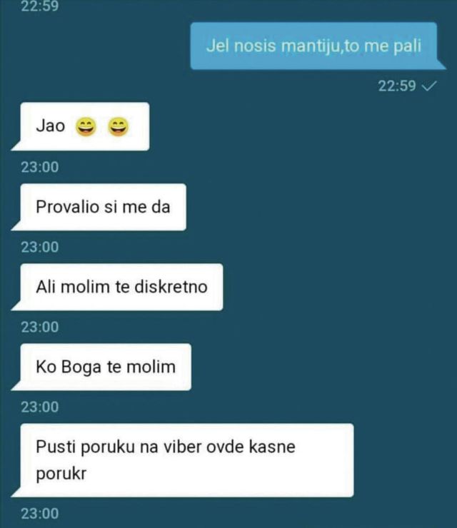 – Jao, provalio si me, da, ali molim te, diskretno. Ko boga te molim. Pusti poruku na Viber, ovde kasne poruke.