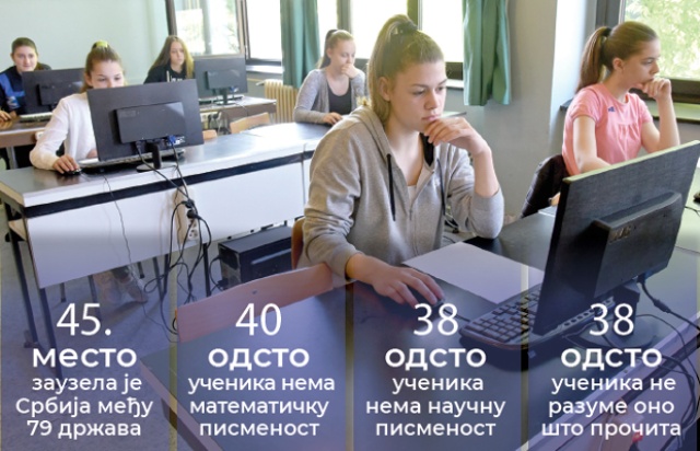 SVAKI treći učenik prvog razreda srednje škole u Srbiji ne dostiže osnovni nivo čitalačke, matematičke i naučne pismenosti. Ovo su pokazali rezultati PISA testiranja učeničkih postignuća za 2018. godinu koji su u utorak, 3. decembra predstavljeni. Srbija je zauzela 45. mesto od 79 zemalja, koliko je učestvovalo u PISA testiranju.