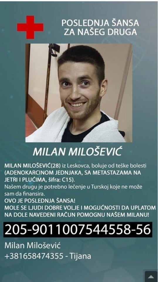 Policijski sindikat Srbije – Negotin uputio je apel za pomoć i solidarnost sa mladim kolegom Milanom Miloševićem iz Leskovca, koji boluje od teške bolesti (ADENOKARCINOM JEDNJAKA, SA METASTAZAMA NA JETRI I PLUĆIMA).
