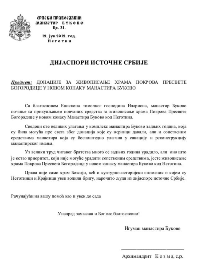 Uz veliki trud bratstva manastira, donacijama vernika i sopstvenim sredstvima, mnogo se toga do sada uradilo u sanaciji i rekonstrukciji manastirskog imanja, ali ono što je ostalo prioritet, koji nije moguće uraditi sopstvenim sredstvima je živopisanja hrama, kaže iguman manastira Bukovo Arhimandrit Kozma Radović u svom pozivu Udruženju “Dijaspori istočne Srbije”.
