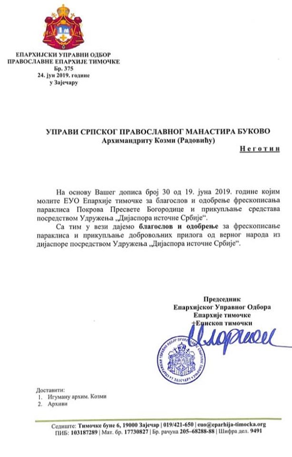 Episkop timočki Ilarion dao je blagoslov i odobrenje za freskopisanja paraklisa i prikupljanje dobrovoljnog priloga od vernog naroda iz dijaspore posredstvom Udruženja “Dijaspora istočne Srbije”.