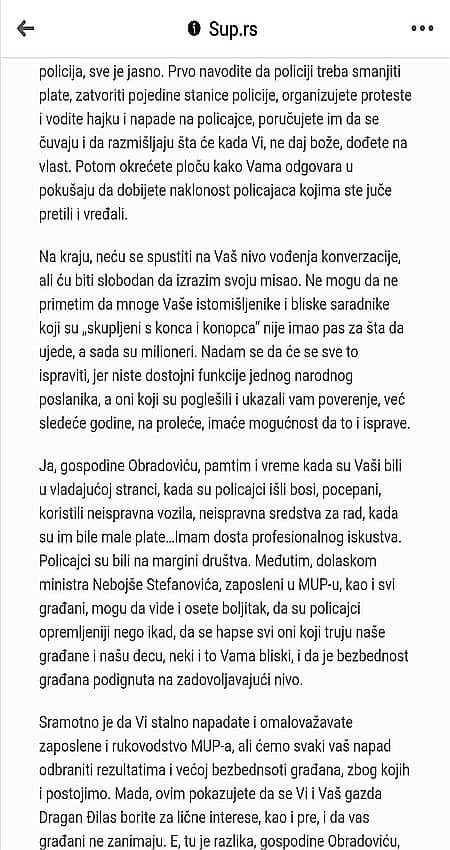 Iz strukovnog udruženja policije od komandira saobraćajne policijske stanice u Sremskim Karlovcima, na optužbe Boška Obradovića – dolaze dalja reagovanja