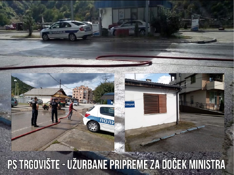 Ništa drugačije nije ni u PS Trgovište gde se odjednom pojavio polikolor za krečenje fasade, okačene su na jarbolu dve nove zastave. Policijski službenici oprali su ceo krug i ulicu ispred zgrade policijske stanice. Radnica higijene je morala da dođe van radnog vremena i da čisti i džogerom prelazi preko tepiha.