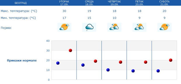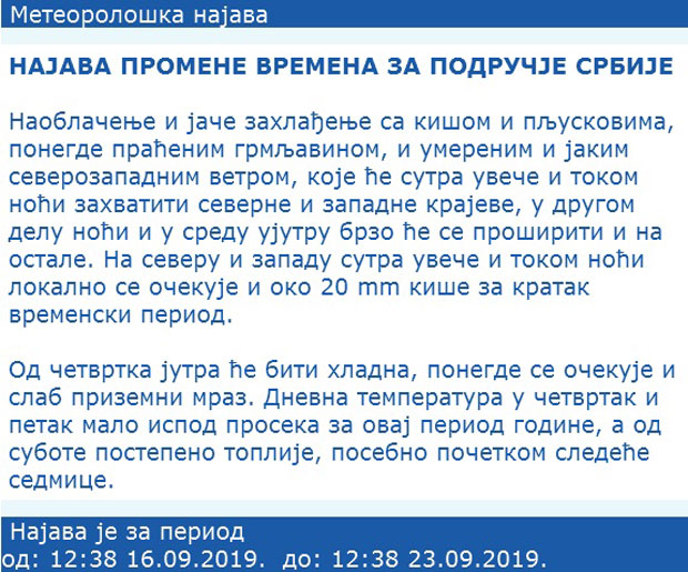 “Naoblačenje i jače zahlađenje sa kišom i pljuskovima, ponegde praćenim grmljavinom, i umerenim i jakim severozapadnim vetrom, koje će sutra uveče i tokom noći zahvatiti severne i zapadne krajeve, u drugom delu noći i u sredu ujutru brzo će se proširiti i na ostale. Na severu i zapadu sutra uveče i tokom noći lokalno se očekuje i oko 20 mm kiše za kratak vremenski period.