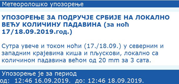 Republički hidrometeorološki zavod izdao je upozorenje za područje Srbije na lokalno veću količinu padavina za noć 17. na 18. septembar.