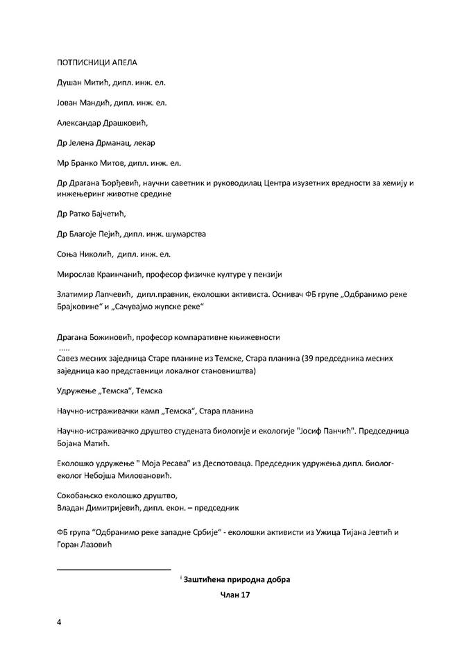 Svesni smo da neke od tih štetnih projekata finansiraju evropske banke, što znači da imaju i podršku zemalja Evrope. Takođe smatramo da zemlje Evrope žele da sarađuju sa Srbijom u lepom partnerstvu, kao i da budu odgovorne prema svetu koji ostavljamo budućim naraštajima.”