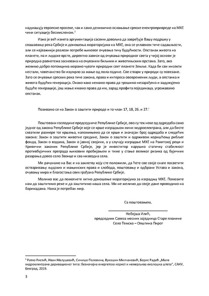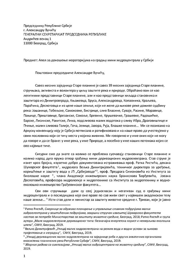 Savez mesnih zajednica Stare planine uz prosleđeno pismo koje su uputili predsedniku Republike Srbije, navode da žele da ukažu na pogubnost finansiranja gradnje MHE, kao i sa idejom da apelujemo na sve one koji svojim etičkim stavom, pravnom snagom i političkim uticajem mogu da pomognu da se zaustavi kršenje krovnih „zelenih“ zakona, kao i da se pronađu bolji modeli održivog snabdevanja energijom.