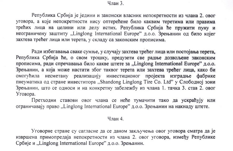 U ugovoru piše: “Radi izbegavanja svake sumnje, u slučaju zahteva trećeg lica ili postojanja tereta, Republika Srbija će, o svom trošku, preduzeti sve radnje dozvoljene zakonskim propisima, radi sprečavanja bilo kakve štete za Linglong”, ističu u Građanskom preokretu.
