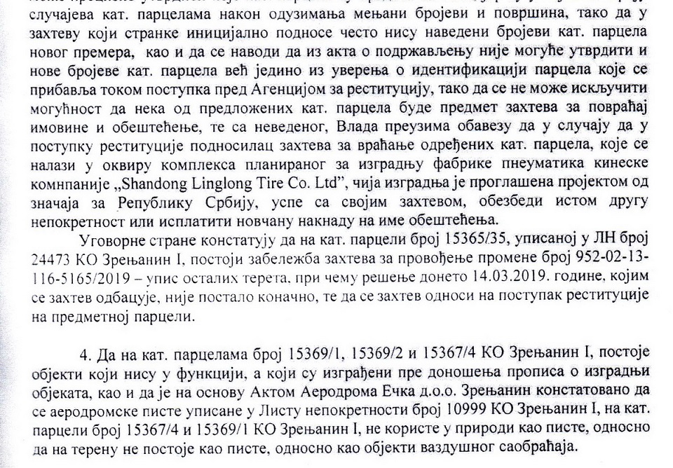Na osnovu zaključka Vlade Republike Srbije, država je ugovorom poklonila kineskom investiroru Linglong više od 96 hektara zemljišta, aerodromsku pistu i pomoćne objekte uz nju, a preuzela je na sebe obavezu da obešteti aktuelne i potencijalne potražioce tog zemljišta u postupku restitucije, kako bi interes Linglonga bio zaštićen.