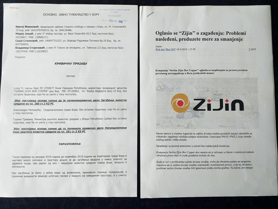 U krivičnoj prijavi koju je agenciji Beta dostavila Irena Živković, jedna od organizatora protesta protiv zagađenja u Boru, i predsednica gradskog odbora Stranke slobode i pravde, navodi se sumnja da je direktor Zidjin Long Yi počinio krivično delo zagađenje životne sredine.