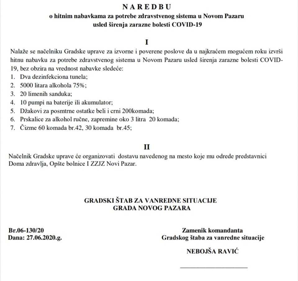 Podsećamo da je Štab za vanredne situacije grada Novog Pazara danas izdao hitnu naredbu o kupovini 20 limenih sanduka i 200 džakova za posmrtne ostatke, što dovoljno govori o trenutnom stanju.