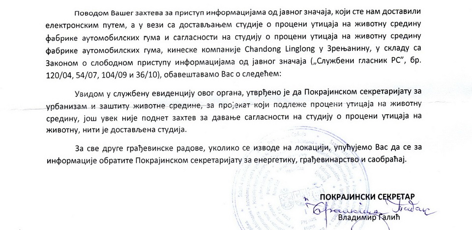 Pokrajinski sekretarijat za urbanizam i zaštitu životne sredine, nakon intervencije Poverenika za informacije od javnog značaja, odgovorio je da mu nije podnet zahtev za davanje saglasnosti na studiju o proceni uticaja na životnu sredinu niti mu je dostavljena takva studija kineske kompanije za proizvodnju automobilskih guma “Šandong Linglong”, saopštio je danas Građanski preokret.