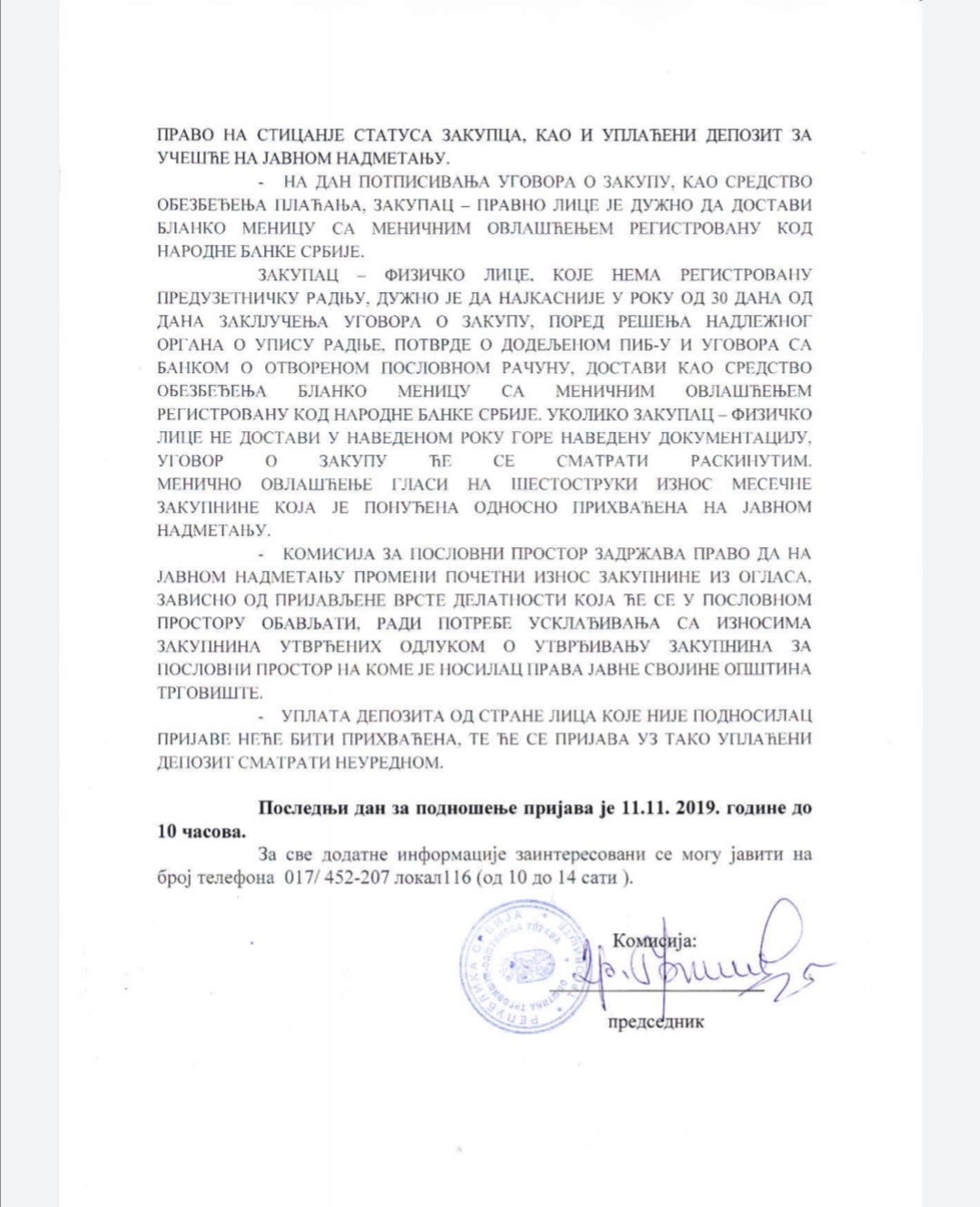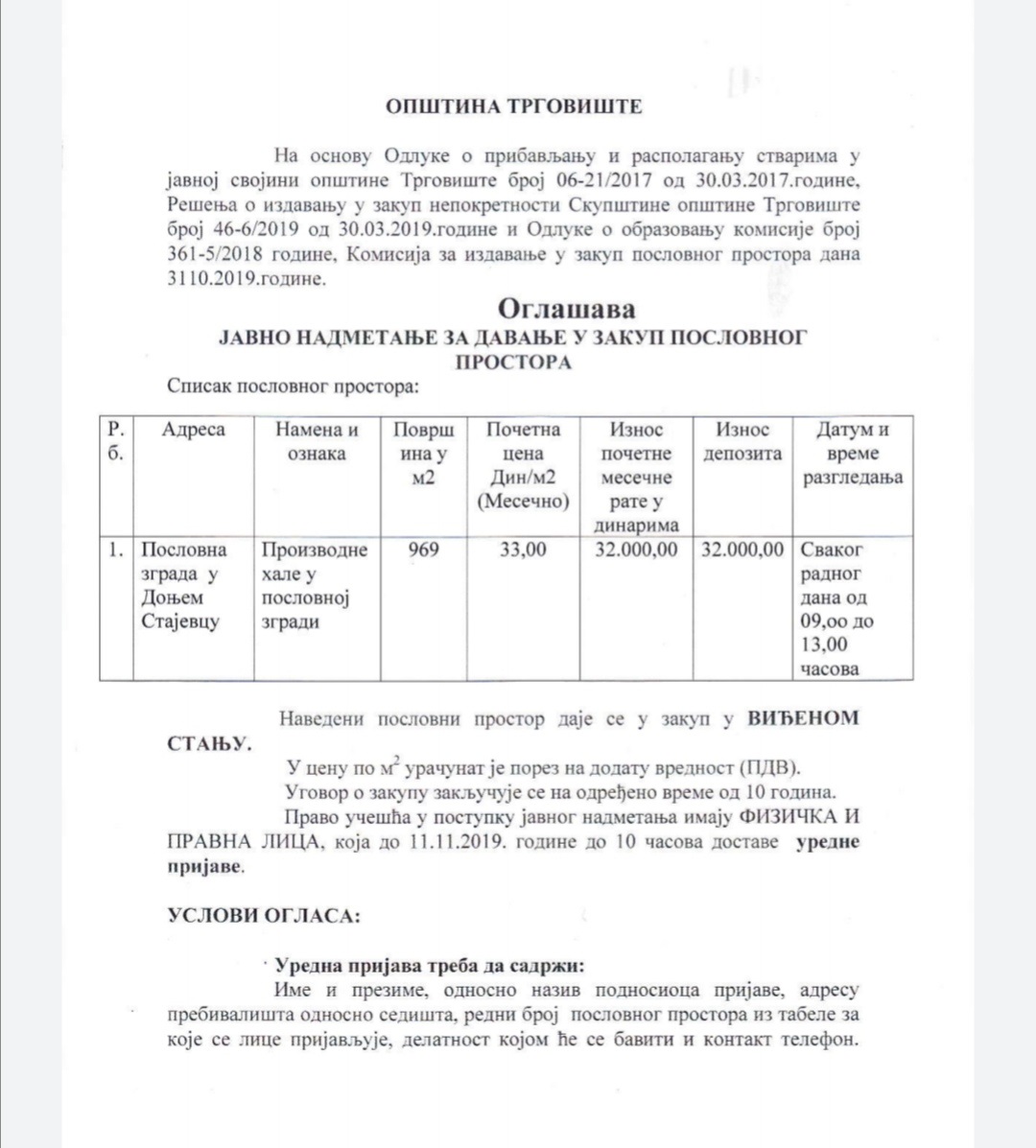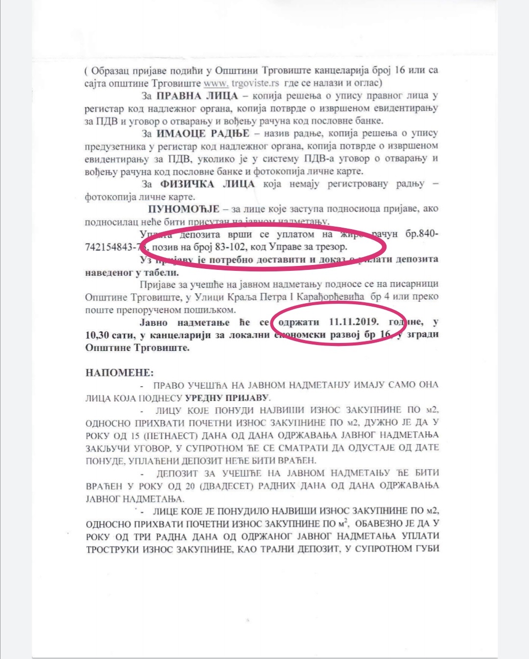 Sumnjamo da je ovaj javni oglas namešten, s obzirom da je zakazan 11.11.2019. godine u 10 časova u zgradi opštine, kada je neradni dan, tj. državni praznik Dan primirja u Prvom svetskom ratu, kada državne institucije ne rade i kada nemoguće održati licitaciju, a imamo takođe proverene informacije da se tog dana niko nije pojavio u zgradi opštine Trgovište.