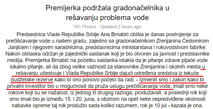 Predsednik Vlade Republike Srbije Ana Brnabić je juče u Zrenjaninu izjavila da je tom konzorcijumu pomoć pružena iz tekuće budžetske rezerve Srbije i da je upravo zbog njega država menjala svoj Zakon o komunalnim delatnostima. Brnabić nije precizirala koliko novca je država dala privatnom investitoru.