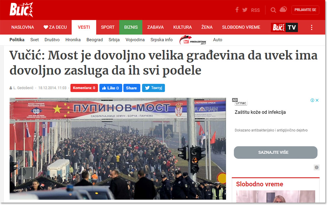 Na svečanom otvaranju „kineskog“ mosta preko Dunava (“Pupinov most“), bili prisutni i premijer Aleksandar Vučić, i bivši gradonačelnik Beograda, Dragan Đilas, kao i tadašnji SNS gradonačelnik Beograda Siniša Mali, ali i Balša Božović, šef gradskog odbora DS-a (koji je tu bio na poziv gradskih vlasti SNS-a!). Tom prilikom, očigledno ciljajući da „javnosti Srbije objasni“ prisustvo ovih čelnika DS-a na tom događaju, tadašnji premijer Aleksandar Vučić je rekao:“Most je dovoljno velika i važna građevina da uvek ima dovoljno zasluga da ih svi podele“! Zamislite samo, upitajte se makar, zar vam nije nimalo čudno zašto tada Aleksandru Vučiću uopšte nije smetalo to što je Dragan Đilas, već tada bio „ukrao preko 600 miliona evra“ – kao što nam sada to govori kao „papagaj“ svaki put – kad ga pomene! Pa zato što ona „finansijska transakcija“ teče, i ne treba je ometati! https://bit.ly/2PYc9p7