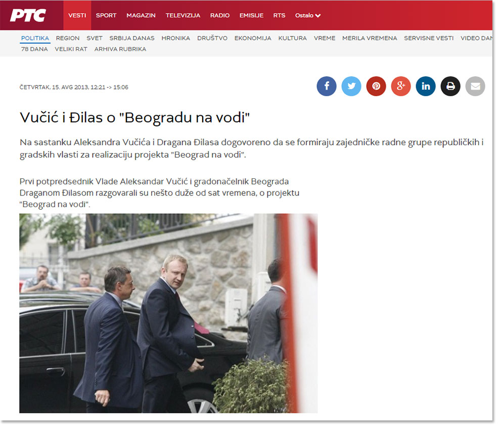 A jel možete da zamislite, kako Aleksandar Vučić i Dragan Đilas, razgovaraju više od 1 časa o realizaciji projekta „Beograda na vodi“! ne verujete? Pa tu vest možete naći na sajtu RTS-a, pod 15 avgustom 2013. godine. Još su se na tom sastanku dogovorili da formiraju zajedničke radne grupe od gradskih i republičkih vlasti: jer je u to vreme Aleksandar Vučić bio prvi potpredsednik vlade, a Dragan Đilas, vladajući uvek gradonačelnik Beograda! Neverovatno mi je da je Aleksandar Vučić, tada nameravao, da u jednu ovakvu veliku finansijsku investiciju, uključi i čoveka, za koga je već tada znao, da je ukrao preko 600 miliona evra! (https://bit.ly/2ShwkBt). O tome piše i “Blic” od 03.08.2013, pod naslovom “Vučić i Đilas grade “Beograd na vodi” (https://bit.ly/2M8FMDe). O tome izveštava i tadašnja B92 (https://bit.ly/2EzddL2) i tabloid “Kurir” (https://bit.ly/36Hf9Nw)
