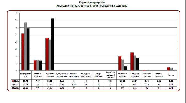 Dok prema podacima iz Izveštaja REM-a tokom prošle godine nijedna komercijalna televizija nije emitovala ni minut programa iz kulture, rijaliti programi su kod pojedinih nacionalnih emitera činili blizu 50 odsto ukupno emitovanog sadržaja.