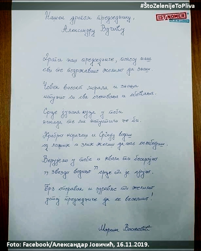 Pročitajte još: Spavaj baba, sve te jebalo, gledala si Vučića i u prvom i u drugom dnevniku… Pismeni zadatak na tenu “Moj predsednik”: “On je najbolji i najlepši predsednik koga je Srbija imala” 100 ovaca i predsednik, večiti Mirno spavaj predsedniče: Žene su na bensedinu, muškarci na rakiji, deca na telefonu, mladi u kockarnici, stari na Vučiću Deda Maksim, vidovnjak šumadijski, poručio Vučiću: Malo da uvuče rogove, neće se lepo provede… Aleksandar Vilotić: Roditeljstvo po Vučiću