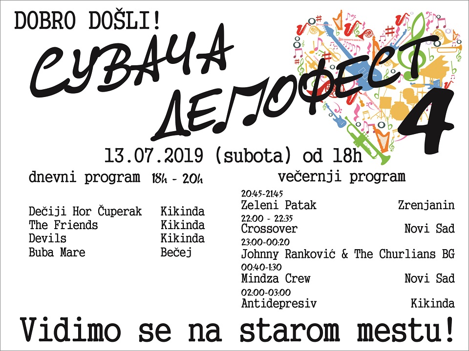 Organizatori su realizovali dva programa i to dnevni program od 18 časova, u kome će nastupati “Dečiji hor Čuperak” i bendovi “The Friends” i “Devils” iz Kikinde, kao i “Buba Mare” iz Bečeja.