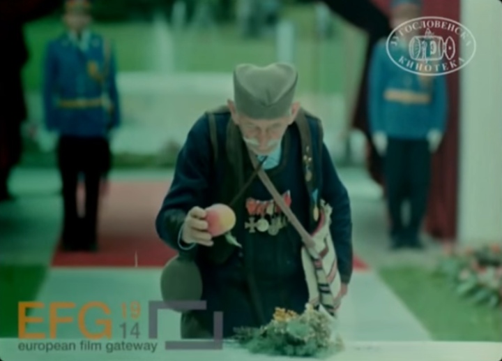 Solunski borac Živojin Lazić stavlja cveće i jabuku iz njegove bašte na grob maršala Tita u Kući cveća (1981).