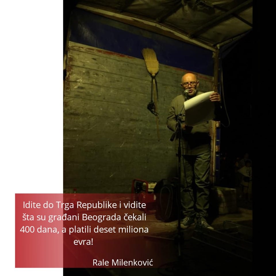 Glumac Radoslav Milenković pročitao je proglas neformalne grupe „Samoodbrana“, koju čine istaknuti intelektualci: „Oćutali smo mnogo toga štetočinskog što je gradska vlast uradila Beogradu. Među njima su Beograd na vodi, gondola na Kalemgdanu, Trg Slavija i ukidanje glavne železničke stanice.