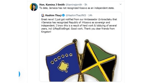 Džonson Smit je retvitovala Tačijevu objavu na Tviteru, uz komentar da „Jamajka ne prepoznaje Kosovo kao nezavisnu državu”.