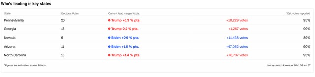 Prema projekcijama CNN, Džo Bajden ima 253, a Donald Tramp ima 213 elektorska glasa, dok prema projekcijama AP-a Bajden vodi sa 264 spram 214 elektorskih glasova (za pobedu potrebno najmanje 270)