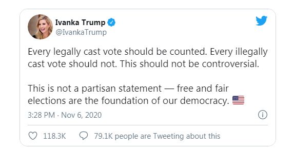 Ćerka aktuelnog predsednika i republikanskog kandidata Ivanka Tramp oglasila se danas na Tviteru i poručila da treba prebrojati svaki legalno dat glas.