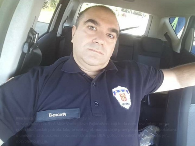 “Stevan Đokić, družbaš Miše Vacića, Lava Pajkića&co. koji bi da nam čuva mlade preko novih Građanskih patrola, lako bi svakog obmanuo da je pravi policajac kao što pokušava, u uniformi, sa značkama i vozilima udruženja DBA, gotovo identičnim MUP-ovim, jer… dozvoljeno mu je.”