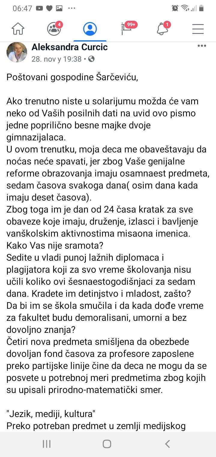 Aleksandra Ćurćić, majka dvoje gimnazijalaca, odlučila je da napiše pismo ministru prosvete Mladenu Šarčeviću. U pismu koje je okačeno na oglasnoj tabli u školi u Čačku ona se osvrnula na veliki broj obaveza koje srednjoškolci imaju, zbog čega, kako kaže, ne stižu da se bave i nekim drugim aktvinostima.