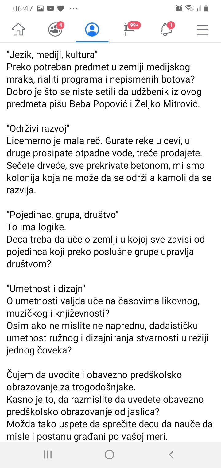 Ova ogorčena mama u pismu Šarćeviću pisala je i o novim predmetima koji su uvedeni, ali i o Vladi punoj lažnih diplomac i samo malo prepisanih doktorata.